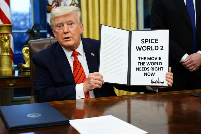 Washington, D.C. – Fresh off reportedly helping push Rush Hour 4 into production, a claim that surprised Hollywood insiders and mildly concerned economists, Donald Trump has now set his sights on another cinematic crusade. He is trying to convince the world that Spice World 2 is the cultural priority of our time. While analysts hoped his sudden Hollywood enthusiasm might fade, sources say he is more fired up than ever. Many are wondering why he is not applying the same level of energy to inflation, job loss, or grocery bills that keep rising month after month.