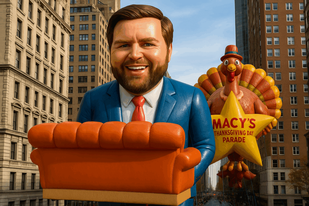 NEW YORK CITY — The 99th Macy’s Thanksgiving Day Parade took an unexpected turn Thursday when the brand-new J.D. Vance balloon drifted off course and bumped directly into the Friends couch float, instantly going viral as #PivotVance.